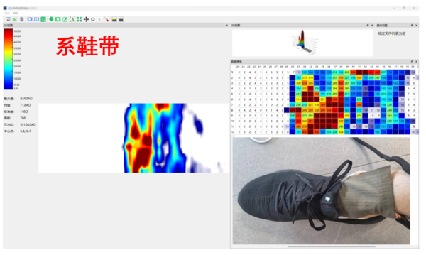 使用埔慧科技可拉伸织物PXS064HS传感器,更好贴合不规则曲面。将传感器放置于鞋内脚背部,之后穿在脚上,即可得到脚背与鞋子之间的压力分布数据。
